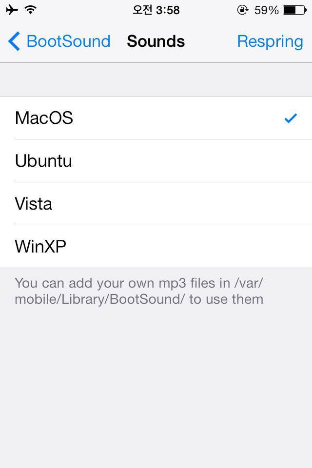 설정-BootSound에서 Sounds를 터치하면 부팅 효과음을 선택할 수 있습니다. 기본 부팅효과음은 MacOS, Ubuntu, Vista, WinXP 이렇게 총 4가지인데요. 부팅효과음을 변경하게 되면 화면 오른쪽 상단에 Respring 버튼이 생기게 됩니다.