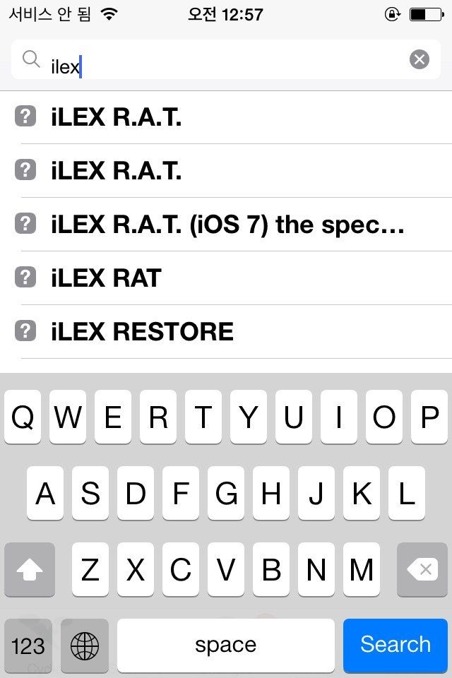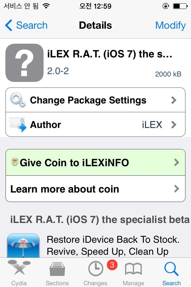 STEP1. 반탈한 아이폰4에서 시디아를 실행 시킨 후 iLEX를 검색합니다. 그러면 아래와 같은 검색결과가 나오는데요. 그 중 iLEX R.A.T (iOS 7) the spec...를 선택해 Install합니다.