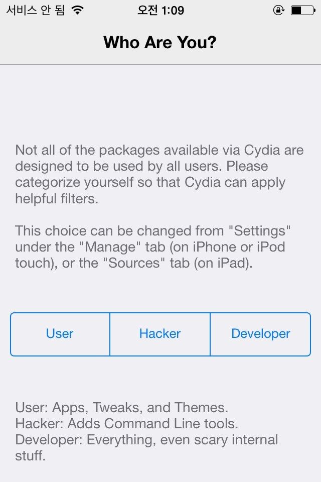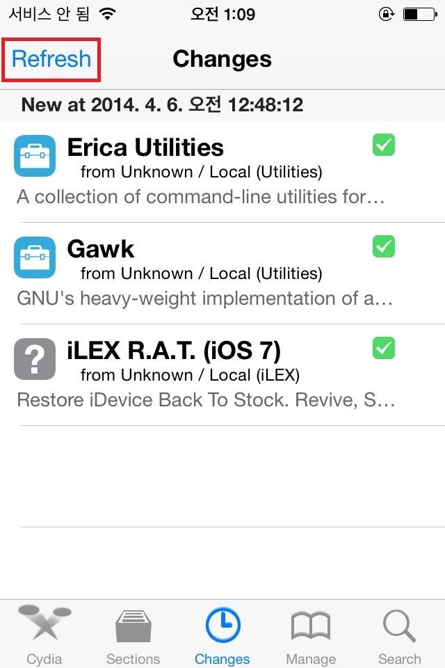 STEP4. 시디아를 실행합니다. 아래는 시디아 첫 화면인데요. User / Hacker / Developer 중 하나를 선택합니다. 그 다음 화면 아래의 메뉴 중 Changes 터치합니다. 그리고 화면 상단 왼쪽의 Refresh를 눌러줍니다.