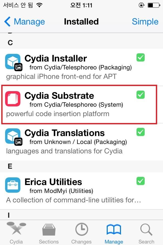 Cydia Substrate 재설치 후에는 모든 시디아 트윅이 정상작동 합니다.