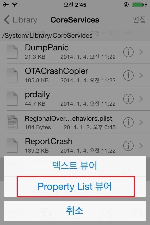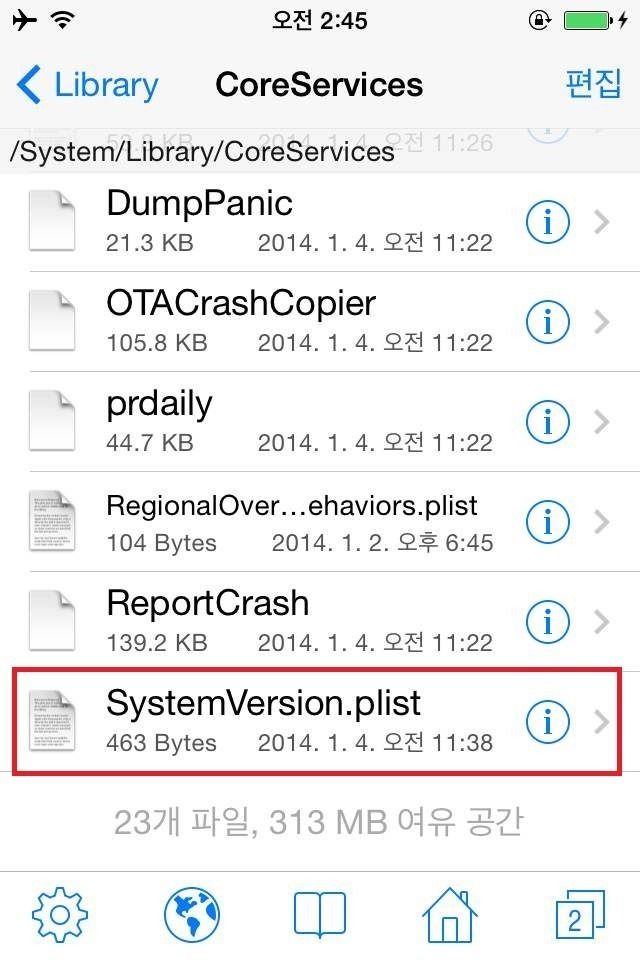 iFile을 실행해 /System/Library/CoreServices 경로로 이동합니다. 그리고 SystemVersion.plist 파일을 터치해 Property List 뷰어를 실행합니다.
