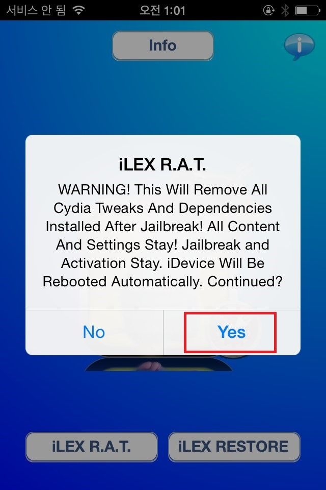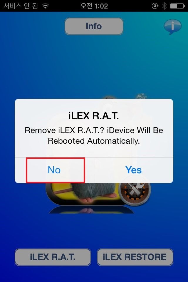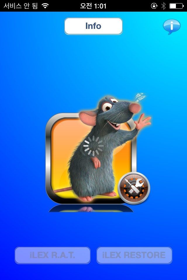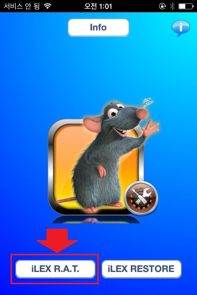 STEP2. 홈화면의 iLEX R.A.T을 터치해 실행시킵니다. 그러면 아래와 같은 쥐그림의 화면이 나오는데요. 화면 하단 왼쪽의 iLEX R.A.T을 터치합니다. 그러면 시디아 트윅을 모두 삭제한다는 경고창이 나오는데요. Yes를 눌러줍니다.
