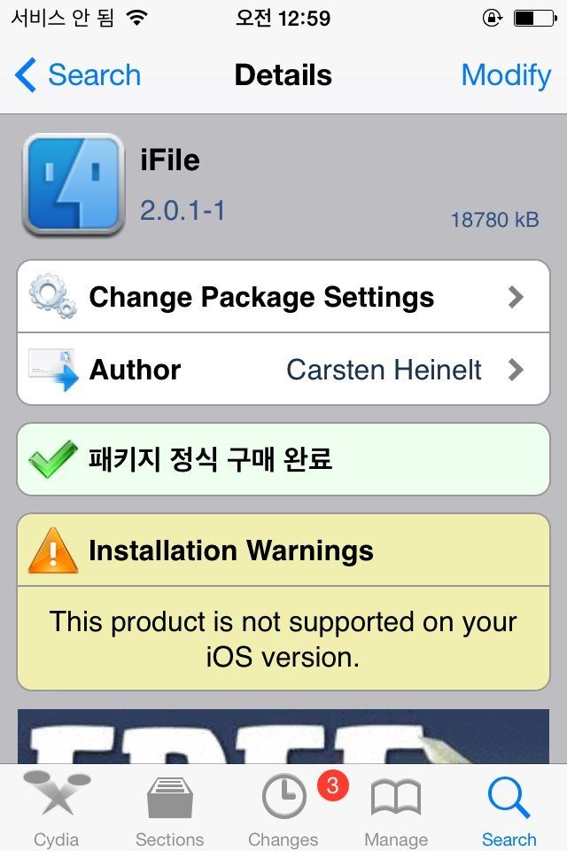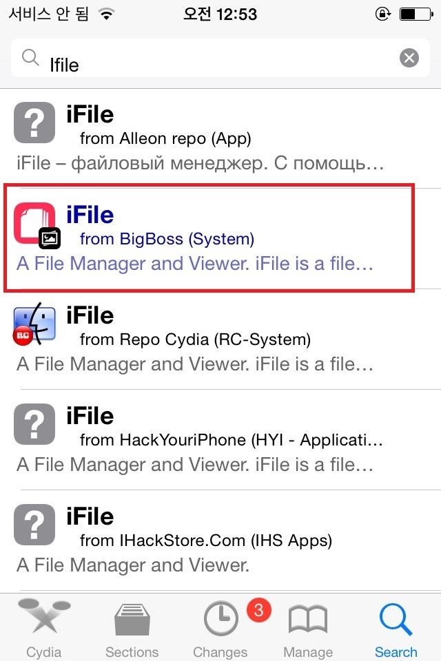 [선택사항]STEP1-2. 이번 과정은 선택사항입니다. iFile을 이용해 iOS7.1 버전을 7.0.6으로 바꿔주는 작업인데요. 시디아 트윅 중 몇몇 트윅이 iOS7.1 버전에서 설치되지 않는 것 때문에 하는 것이니 필요하신 분들만 따라하세요. 시디아에서 iFile을 검색해 Install 합니다.