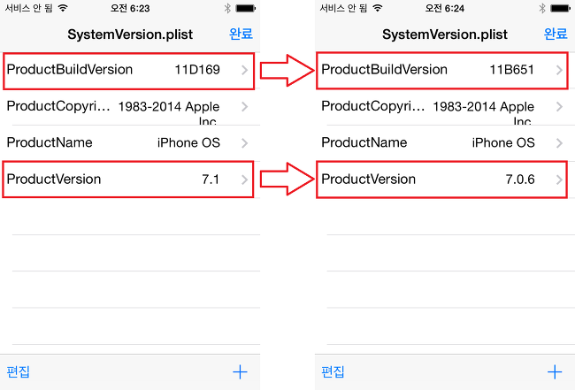 그리고 아래 그림과 같이 ProductBuildVersion을 11B651로, ProductVersion을 7.0.6으로 수정한 뒤 화면 상단 오른쪽의 완료를 눌러줍니다.