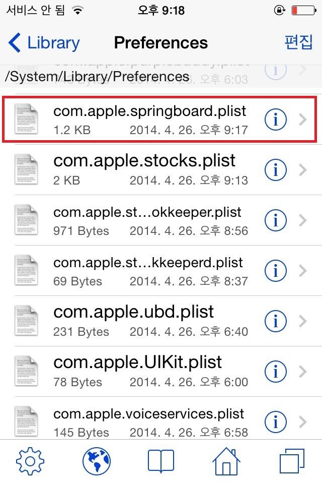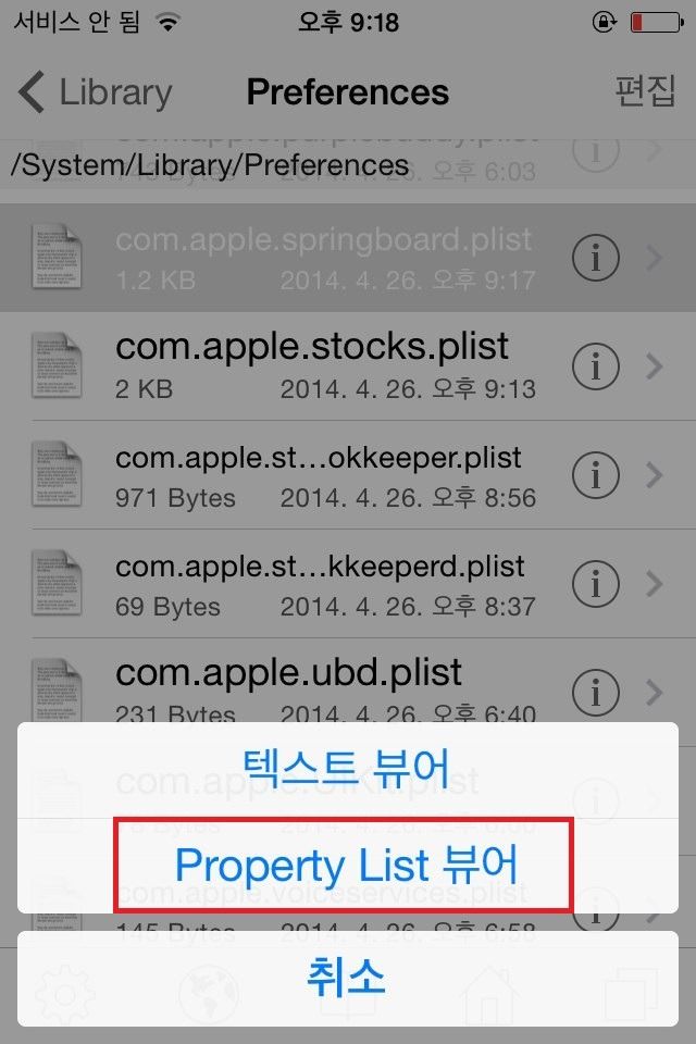 STEP2. iFile을 실행해 /System/Library/Preferences 경로로 이동합니다. 그리고 com.apple.springboard.plist를 터치한 다음 Property List 뷰어를 실행합니다.