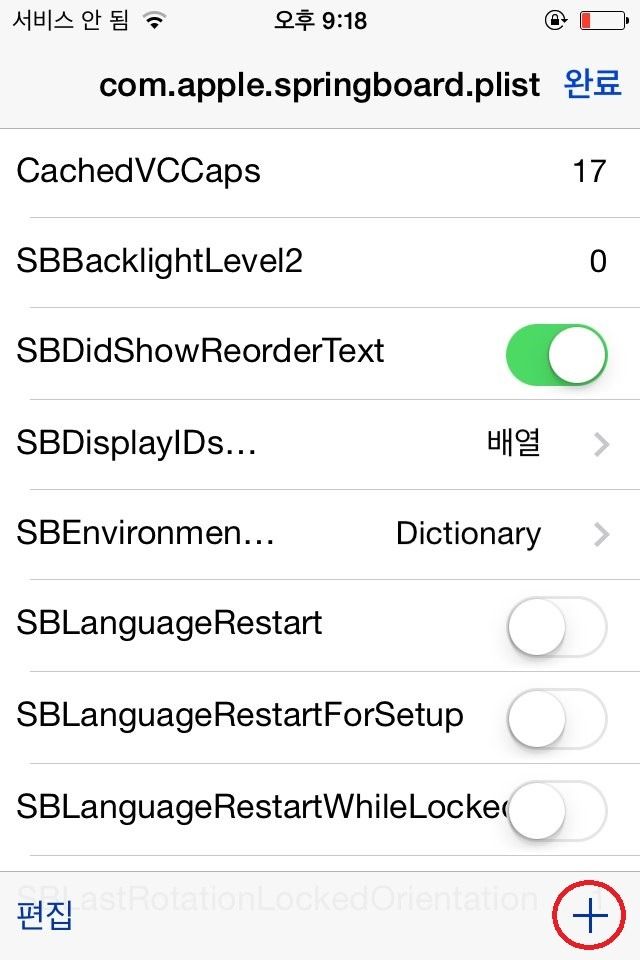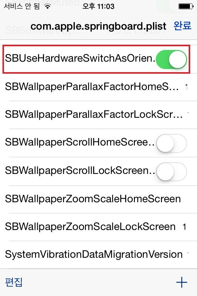 STEP5. SBUseHardwareSwitchAsOrientationLock 버튼을 활성화해준 뒤 화면 상단 오른쪽의 완료를 누릅니다. 그리고 리스프링하면 아이폰의 진동버튼이 화면잠금버튼으로 바뀌게 됩니다.