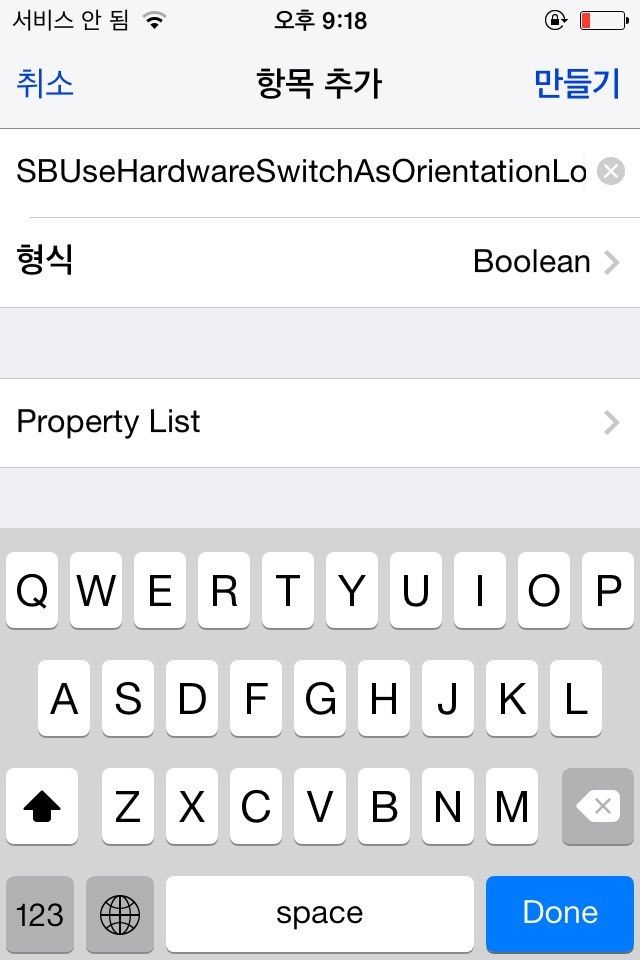 STEP4. 첫 번째 줄에 SBUseHardwareSwitchAsOrientationLock을 입력합니다. 그리고 두번째 줄의 형식을 터치해 Bloolean을 선택한 뒤 화면 상단 오른쪽의 만들기를 눌러줍니다.