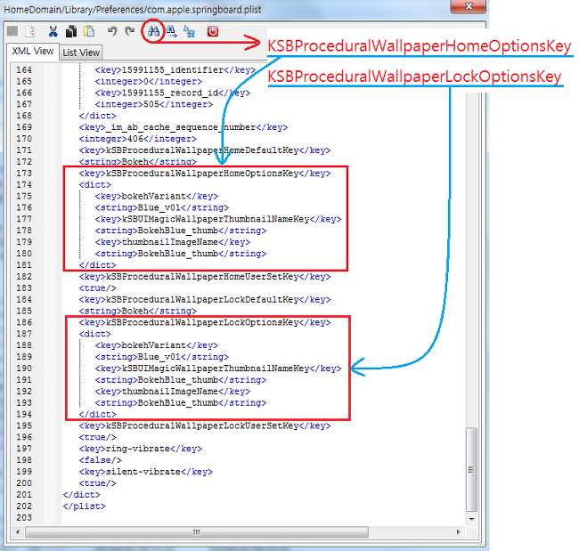 아래는 com.apple.springboard.plist 파일의 편집화면인데요. 화면 상단의 쌍안경 모양의 그림을 클릭한 다음 아래의 문구를 검색해 찾습니다(빨간네모박스).