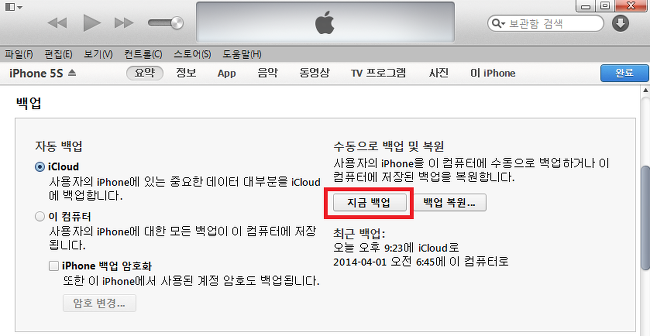 STEP2. 이 작업을 하기 위해선 아이튠즈(iTunes) 백업을 해야 합니다. 아래와 같이 PC에서 아이튠즈(iTunes)를 실행한 다음 지금 백업을 합니다.