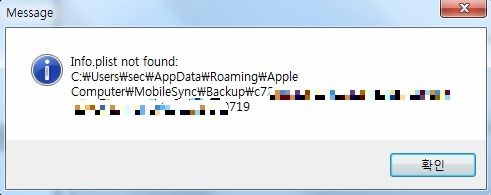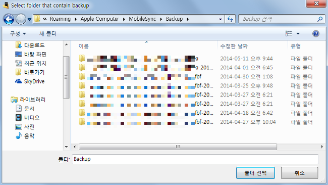 만약, 위와 같이 백업폴더가 보이지 않는다면 화면 상단 왼쪽의 불러오기 버튼을 눌러 C:\Users\사용자이름\AppData\Roaming\Apple Computer\MobileSync\Backup 폴더에서 방금 백업한 폴더를 불러오기 하면 됩니다.