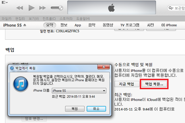 STEP6. PC와 아이폰을 연결한 후 STEP2에서 백업한 날짜와 시간의 것으로 복원을 합니다.