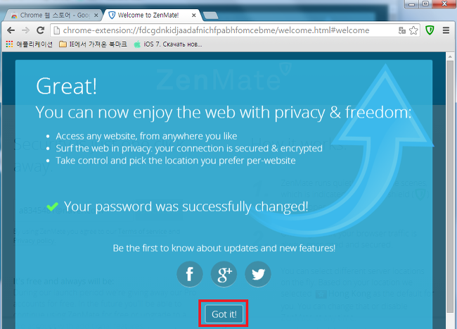 패스워드를 변경한 뒤 위 그림과 같이 Go it!을 클릭하면 IP 우회를 할 수 있게 됩니다.