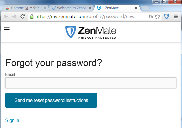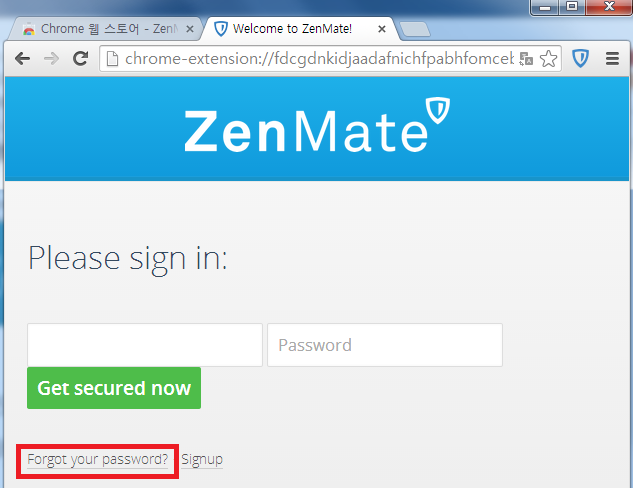 ZenMate를 재설치 할 경우 이메일을 입력하고 Get secured now를 클릭하게 되면 아래와 같이 Sign in 하는 화면이 나오는데요.