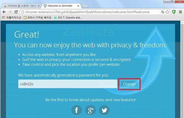 STEP4. 이메일을 입력하고 Get secured now 버튼을 클릭하면 아래와 같이 초기 패스워드 값이 보이는 화면이 나타납니다. 이것은 zenmate를 Sign in 할 때 필요하므로 초기 패스워드를 자신이 기억하기 편한 것으로 바꿔줍니다.