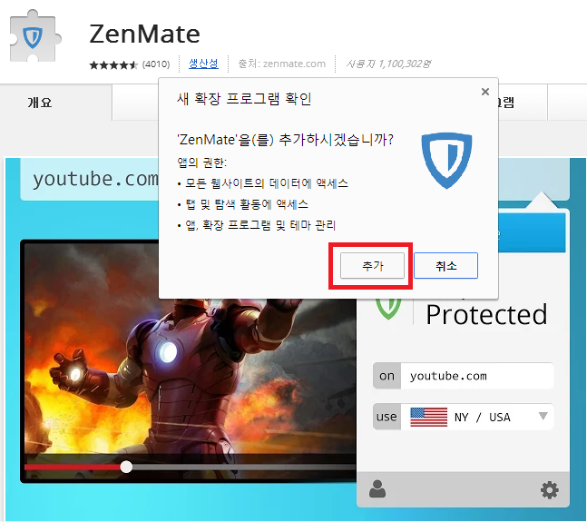STEP2. 'ZenMate'을(를) 추가하시겠습니까? 라는 팝업창이 뜨는데요. 아래와 같이 추가버튼을 클릭합니다.