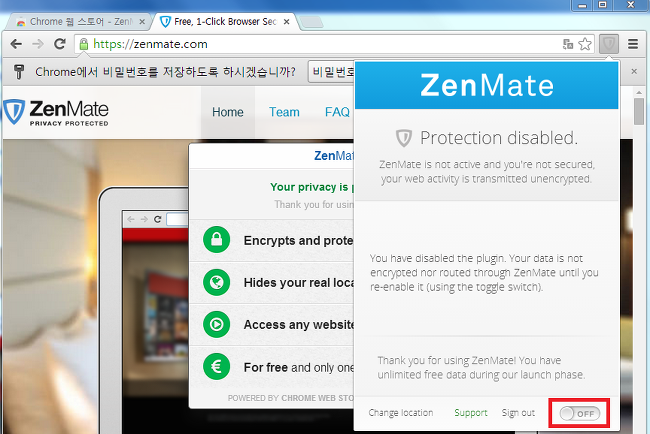 IP 우회를 한 상태에서 인터넷을 이용할 경우 속도면에서 좋지 않기 때문에 IP 우회가 필요없을 경우에는 아래와 같이 ZenMate를 OFF 시켜두고 필요할 때만 ON 하세요.