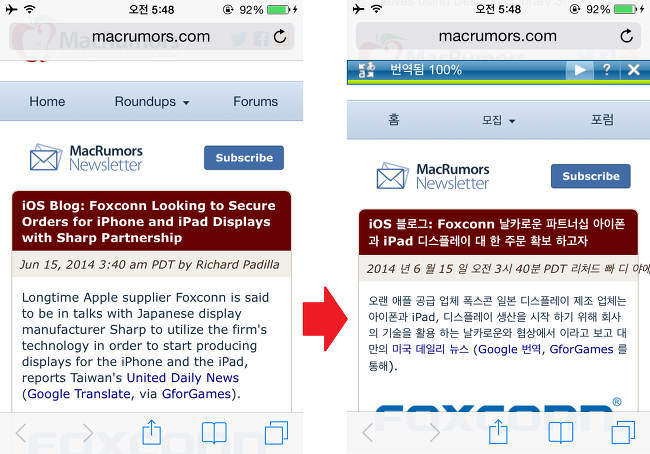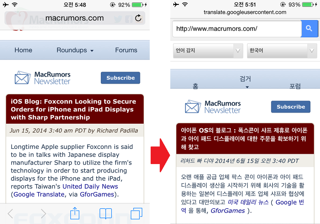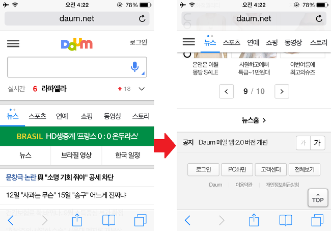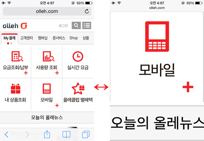 ▲ 모바일 웹페이지 원래 화면(좌) / 확대 화면(우)