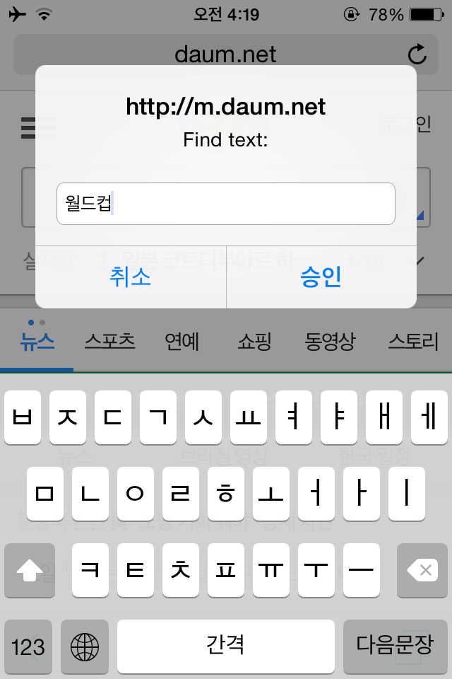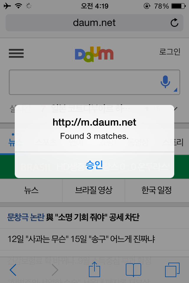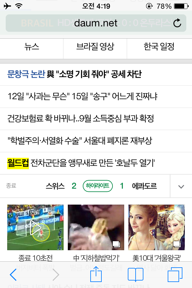 아래 그림은 Daum 모바일 화면에서 웹페이지 맨 밑으로 내리기 책갈피 기능을 실행한 화면입니다.
