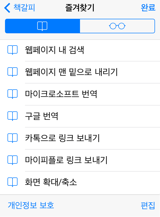 아이폰의 사파리의 기능 중 책갈피라는 기능이 있습니다. 이것은 인터넷 익스플로러(Internet Explorer)의 즐겨찾기와 같은 역할을 하는 기능인데요.