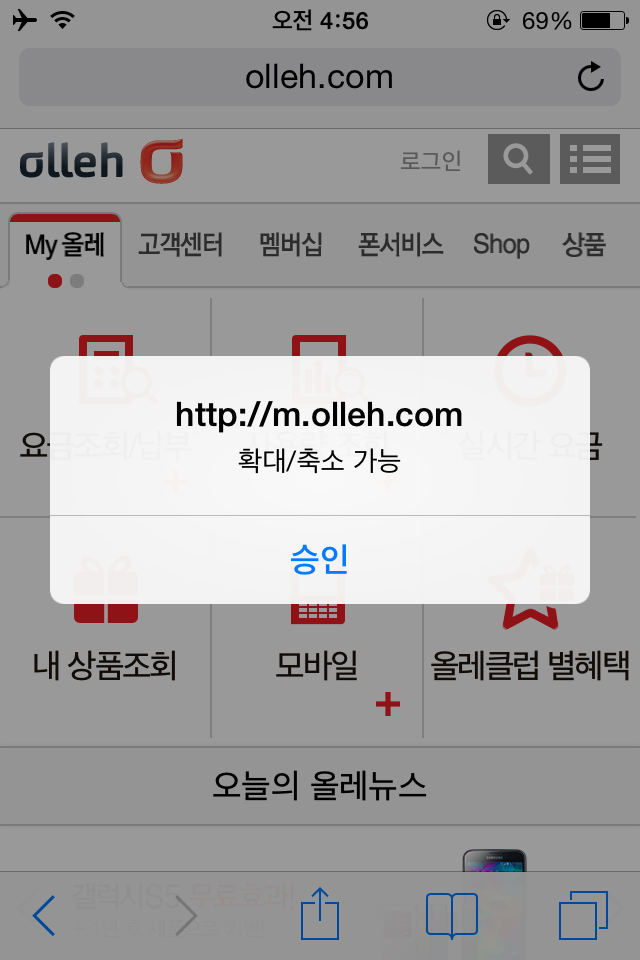 승인 버튼을 누르고 나면 모바일 웹페이지 화면의 확대/축소가 가능해 집니다. 확대/축소는 두 손가락으로 화면을 늘리고 줄이면 됩니다.