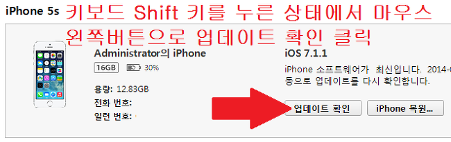 아이튠즈에서 Shift + 업데이트 확인을 클릭하고 다운받은 펌웨어를 선택하면 업데이트가 진행됩니다.(아래그림참고)
