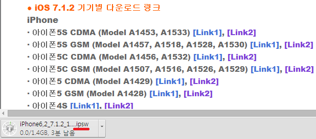 ※ 위 링크를 인터넷 익스플로러에서 클릭해 다운로드 받을 경우 아래그림처럼 파일 확장자명이 zip으로 다운로드되는데요. 다운로드 완료 후 파일 확장자명 zip을 ipsw로 바꾸고 사용하시면 됩니다. 참고로, 구글크롬에서는 ipsw로 다운로드 됩니다.