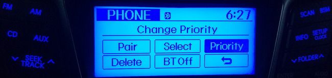 만약, 블루투스 연결한 기기가 많을 경우 블루투스 연결 우선 순위를 정해 놓을수도 있는데요. 아이폰이 우선순위가 아닐 경우 현기차의 차량 오디오에서 SETUP-PHONE을 선택한 다음 아래와 같이 Priority를 선택합니다.