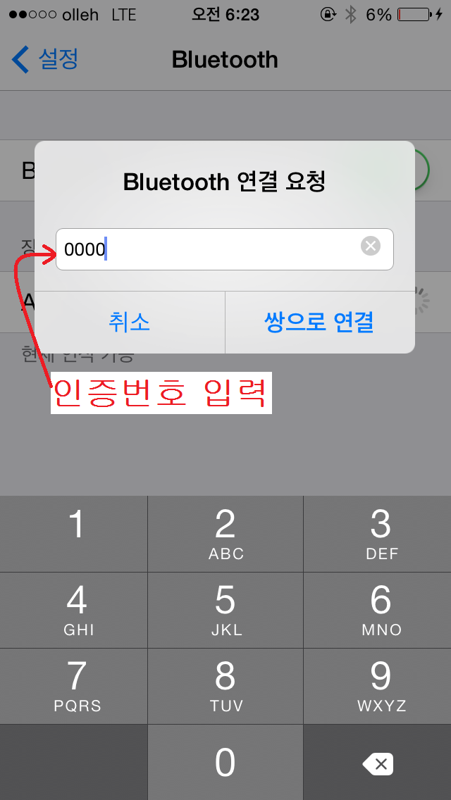 이때 현기차의 오디오 화면에 나오는 인증번호 4자리를 아래와 같이 아이폰의 설정-블루투스에 입력해주면 됩니다.