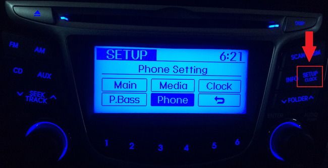 STEP1. 우선 아이폰의 블루투스를 켭니다. 그리고 현기차의 시동을 걸어 오디오 전원을 킵니다. 그리고 아래 그림과 같이 SETUP 버튼을 눌러 줍니다.