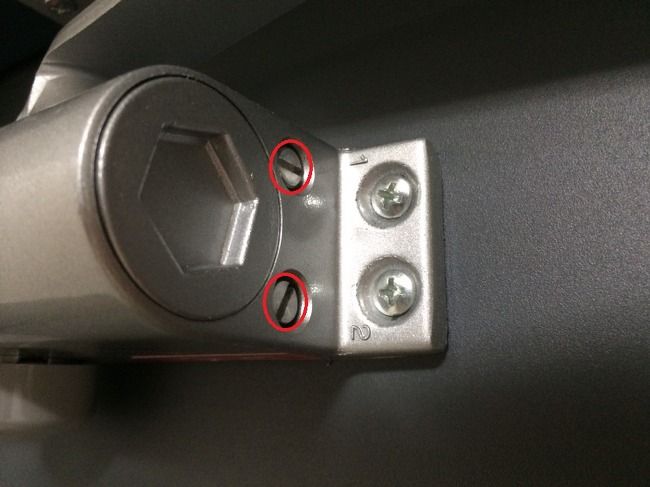 도어클로저(도어체크)를 좀 더 확대해 보면 아래와 같이 두개의 일자 나사가 보일겁니다. 이 나사를 조이거나 풀면서 문 닫힘 속도를 조절할 수 있는데요.