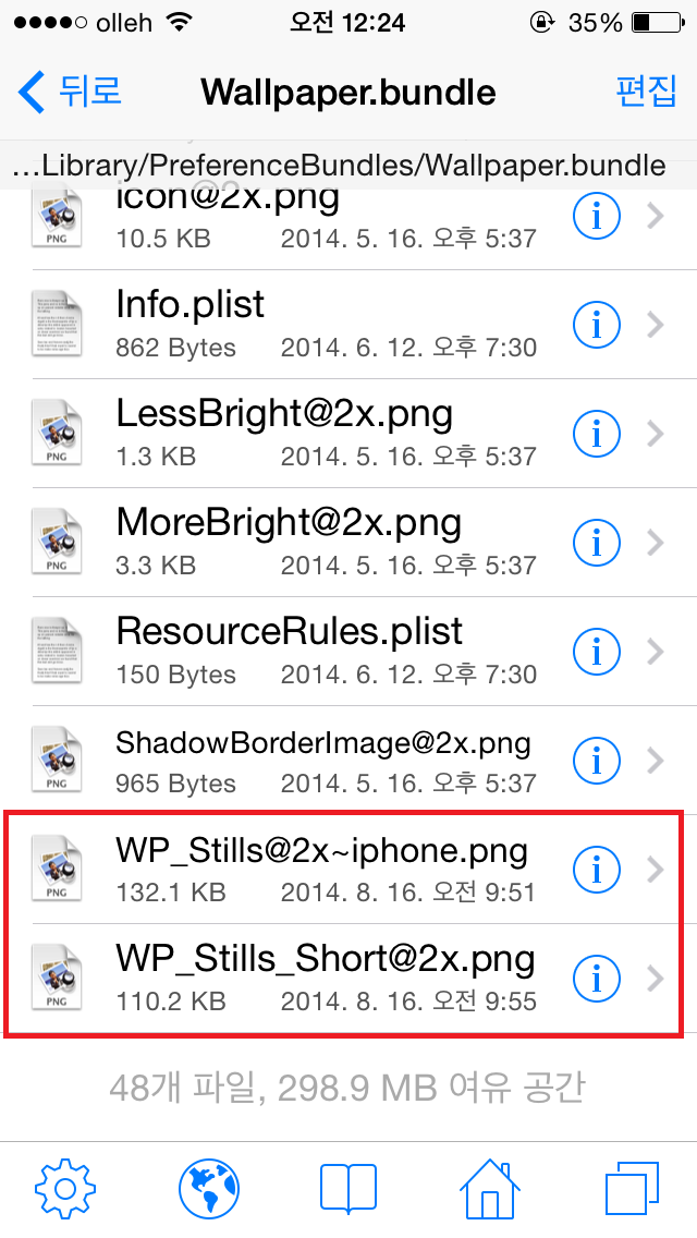 그러면 WP_Stills@2x~iphone.png, WP_Stills_Short@2x~iphone.png 이렇게 2개의 파일이 나옵니다. 이 파일들을 복사해 아이폰의 /System/Library/PreferenceBundles/Wallpaper.bundle/ 폴더안에 붙여넣기 합니다.