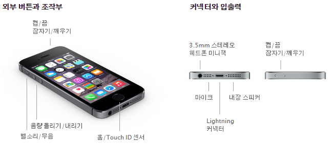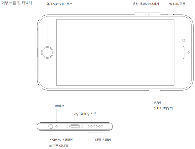 외부 버튼의 가장 큰 변화라고 하면 위쪽에 위치해 있던 켬/끔 잠자기/깨우기 버튼, 일명 슬립버튼이 아이폰 측면 오른쪽으로 이동한 것입니다. 또한 아이폰 밑부분의 마이크면적은 더 작아졌으며 기존의 Lightning 커넥터를 아이폰6, 아이폰6 플러스에서도 유지하고 있습니다.