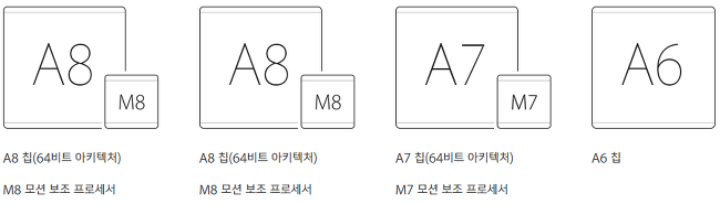 칩은 아이폰6와 아이폰6 플러스 모두 A8 칩에 M8 모션 보조 프로세서를 사용하고 있습니다.