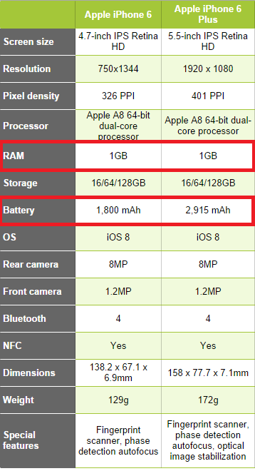지금까지 알아본 아이폰6와 아이폰6 Plus의 스펙 내용 중 차이점을 요약 정리해보면 아래와 같습니다.