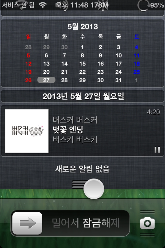 자, 밀어서 잠금해제라는 문구가 보이는데 알림센터도 같이 보이죠? ^^ 이제 잠금화면 상태에서도 알림센터가 활성화가 되었습니다. 그렇다면 알림센터를 좀 더 유용하게 활용하는 방법을 알아봐야죠~