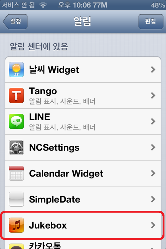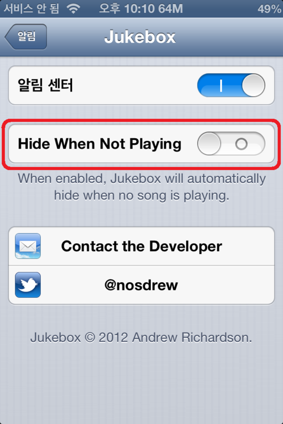 그러면 알림센터에서 이 트윅이 나타나는데요. 알림센터를 보기 전에 위 그림에서 Jukebox 를 터치하면 아래 그림처럼 설정하는 화면이 나옵니다.