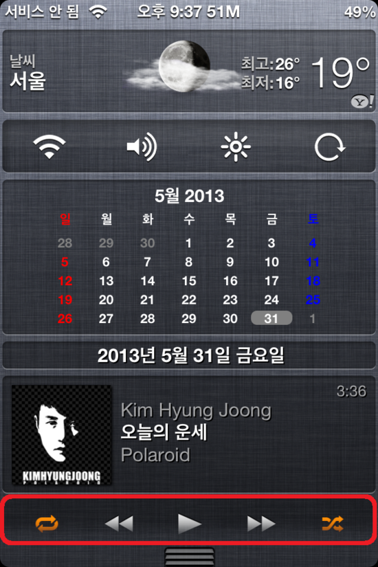 위 그림을 보면 일단 앨범사진이 보이고, 옆에 가수명과 노래제목이 보입니다. 그런데 음악재생 컨트롤이 안보이는데요. 빨간네모박스 안을 한번 터치하게 되면 음악 재생 컨트롤이 나타나게 됩니다.