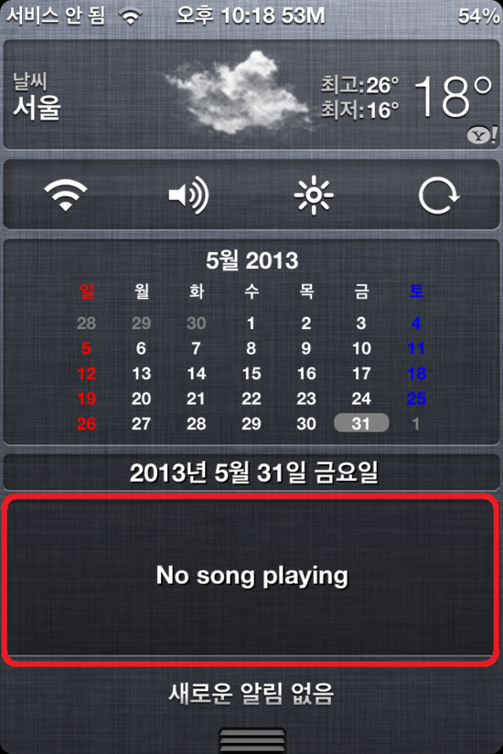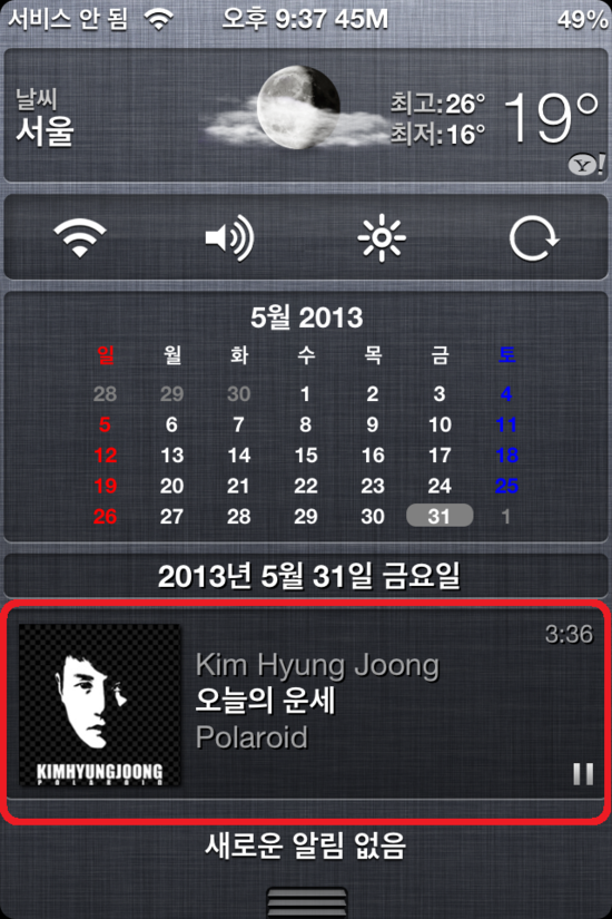 자, 그럼 이제 알림센터를 내려보겠습니다. 첫번째 사진(왼쪽)이 음악이 재생되지 않을 때 화면인데요. 위에서 얘기한 설정부분을 활성화 시켜주면 음악이 재생되지 않을 땐 아래 그림의 빨간네모박스 부분이 아예 나타나지 않습니다. 단, 음악어플이 실행 중(앱스위처에 남아 있을 땐)일때는 두번째 사진(오른쪽)처럼 보이게 됩니다. ^^ 이 설명이 더 헷갈리나요?? ^^;;;