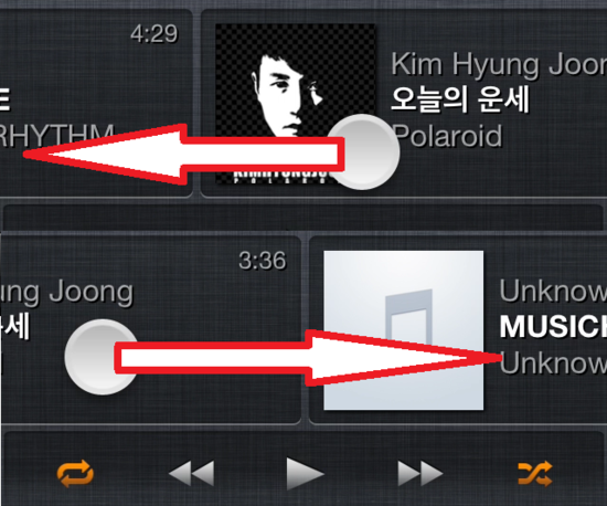 왼쪽으로 슬라이드 하면(윗 그림) 다음 곡이, 오른쪽으로 슬라이드 하면(아래 그림) 이전 곡이 재생됩니다.