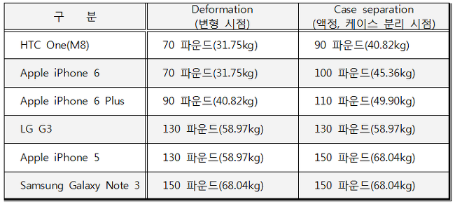 그동안 논란이 되었던 아이폰6 플러스의 휘어짐은 90 파운드(약 41kg)의 힘에서 시작되었으며, 110 파운드(약 50kg)의 힘에서 액정과 케이스가 분리되기 시작했습니다. 아이폰6는 이보다 약한 70파운드(약 32kg)의 힘에서 휘어지기 시작했으며, 100 파운드(약 45kg)의 힘에서 액정과 케이스가 분리되기 시작했습니다.