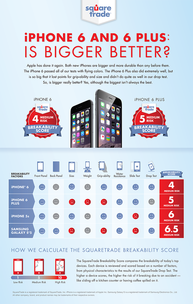 스마트폰의 전면 및 후면 패널, 크기, 무게, 그립감 등의 품질 외에 물에 대한 저항력, 밀기, 낙하실험 등 다양한 항목에 걸쳐 실험을 진행한 후 테스트 결과를 1~10점으로 점수를 매겨 Breakability Score를 발표한 것입니다. Breakability Score는 점수가 높을수록 파손될 위험이 높음을 뜻하는데 여기서 아이폰6는 4점을, 아이폰6 플러스는 5점을 받았습니다. 갤럭시S5가 6.5점인 것과 비교하면 꽤 안정적인 결과를 받은 셈인거죠.