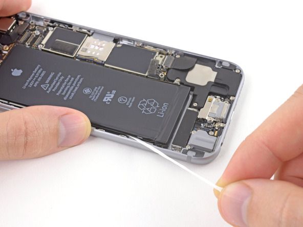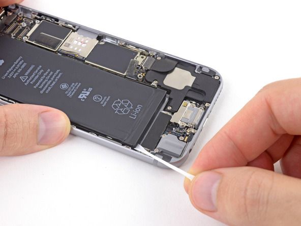▶ 테이프를 완전히 제거하지 못했다면 배터리는 후면케이스와 붙어 있을 겁니다. 이것을 좀 더 편하게 분리하려면 아이폰 뒷면을 헤어드라이어로 조금 가열하는 것이 좋습니다. 그 다음 플라스틱 카드를 배터리 왼쪽 옆면에 끼운 후 아래 사진처럼 멀어서 배터리를 떼 냅니다.