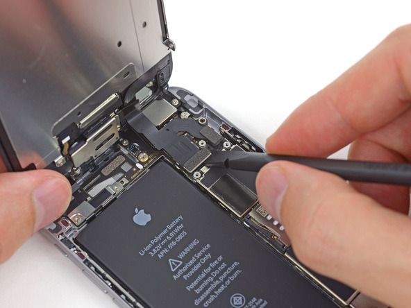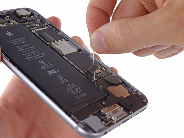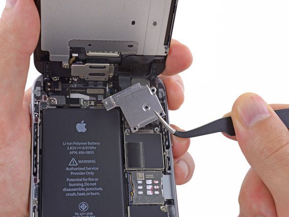 ② 아래 그림과 같이 나사가 제거된 철판을 아이폰6 본체에서 빼냅니다.