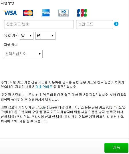 그리고 지불 방법을 입력하고 화면 하단의 계속 버튼을 클릭하면 주문이 완료됩니다. 신용카드의 경우 VISA 또는 MasterCard로 결제하면 됩니다.