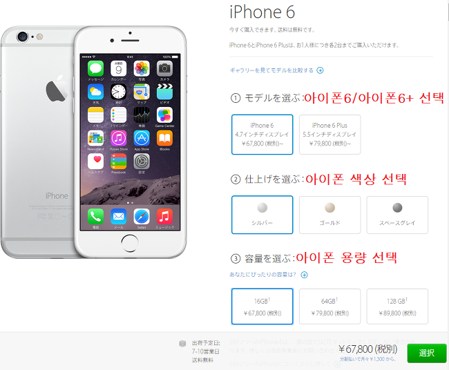 STEP1. http://store.apple.com/jp/buy-iphone/iphone6 를 접속합니다. 그리고 자신이 사고 싶은 아이폰을 ①, ②, ③ 순서대로 선택합니다.