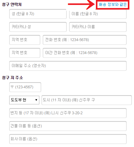 STEP7. 한번 더 배송 정보를 입력하는 화면이 나오는데요. 아래와 같이 배송 정보와 같은(?)을 클릭하면 아까 입력한 내용이 자동으로 입력됩니다.