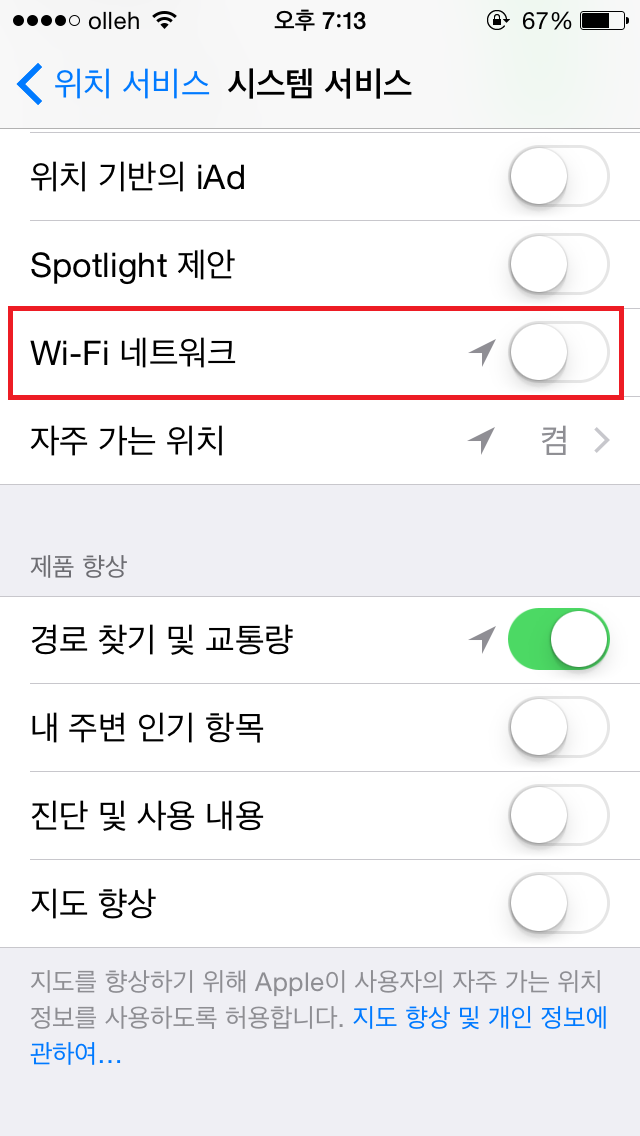 네트워크 설정 재설정을 했음에도 와이파이 연결이 불안정하다면 아이폰의 설정>개인 정보 보호>위치 서비스>시스템 서비스에서 Wi-Fi 네트워크 버튼을 끄고 와이파이를 다시 연결해 보시기 바랍니다.