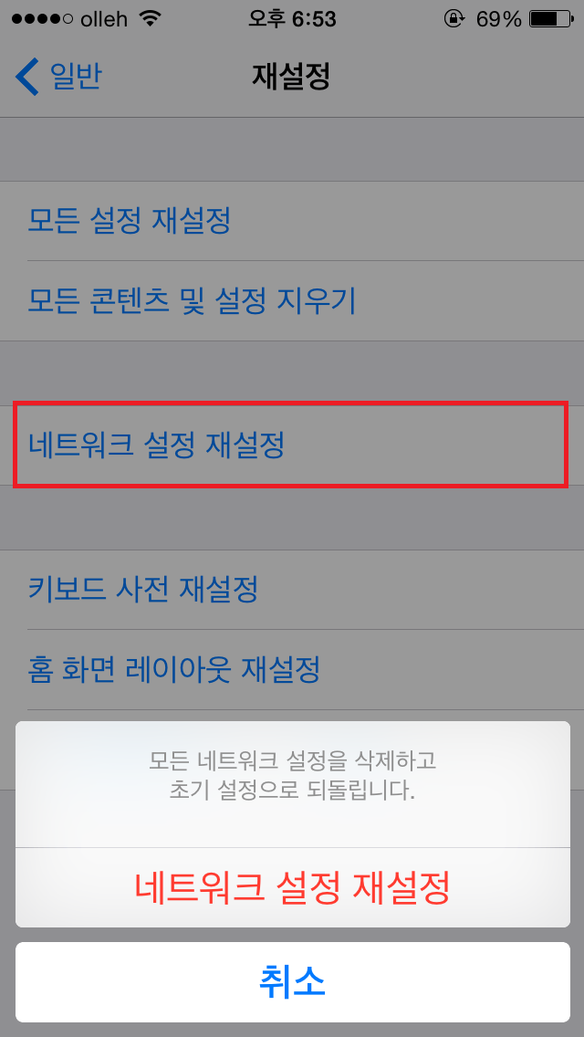 이것을 실행하게 되면 아이폰이 재부팅 되면서 아이폰에 설정되어 있는 네트워크 설정 정보(와이파이 암호, 캐시, DHCP 정보 등)가 초기화 됩니다.
