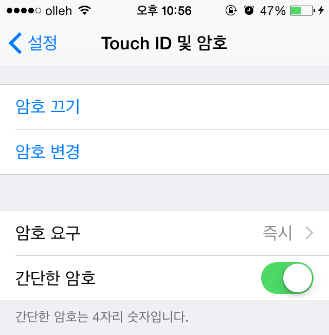 4. 암호가 설정되어 있다면 설정>Touch ID 및 암호에서 암호 끄기를 합니다.