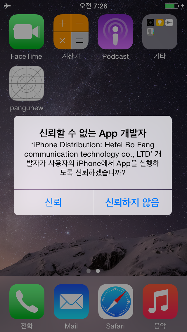 STEP4. 탈옥과정이 거의 끝나갈 무렵 아래 그림과 같이 탈옥툴에 Jailbreaking이라고 나올 때, 애플기기 홈화면에 "신뢰할 수 없는 App 개발자"라는 팝업창이 나타납니다. 이때 신뢰 버튼을 터치합니다.